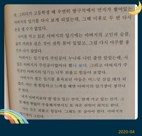 小時候,我以為日記的主人公是我和姐姐,而實際上爸爸才應該是日記的主人公。而且,日記中的爸爸看起來異常孤單疲憊。那個曾經(jīng)偷看爸爸日記的兒子現(xiàn)在也已經(jīng)30多歲了,每當我為生活而感到疲憊的時候,我都會想起爸爸的日記。