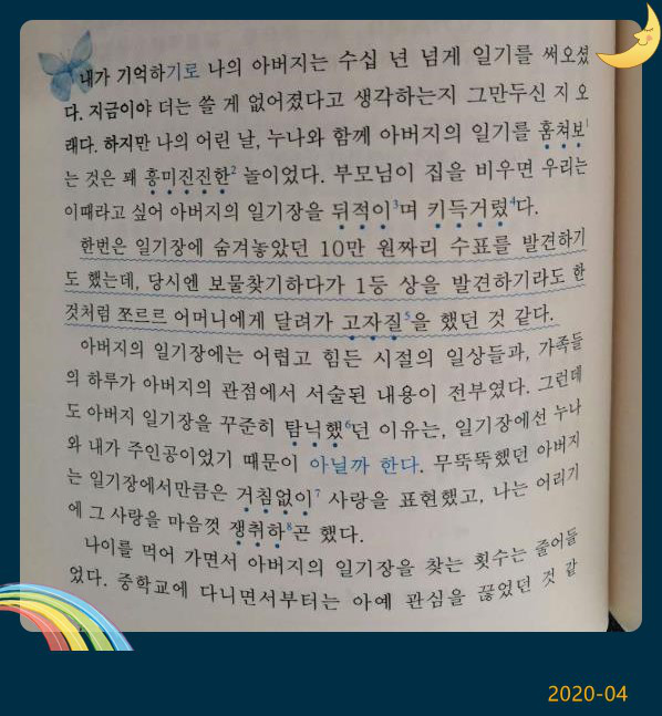 曾經(jīng)有一次發(fā)現(xiàn)了藏在日記本里的一張10萬韓元的支票,當時我們就像尋寶途中發(fā)現(xiàn)了新大陸一樣,一溜煙地跑到媽媽那里去告狀。